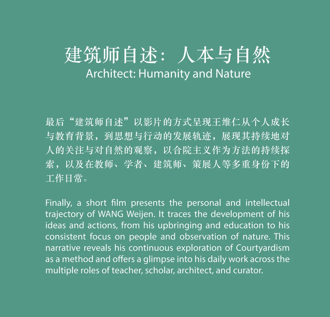 WANG Weijen. It traces the development of his ideas and actions, from his upbringing and education to his consistent focus on people and observation of nature. This narrative reveals his continuous exploration of Courtyardism as a method and offers a glimpse into his daily work across the multiple roles of teacher, scholar, architect, and curator.