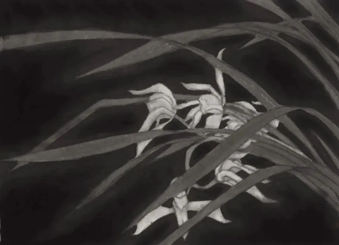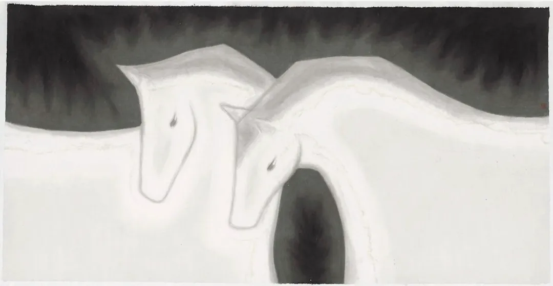 相较而言,我们还是能感受到,黄丹的马等动物是朝着简的方向走的,而梅、兰、竹、菊等,似乎又是朝着繁的方向挖掘更多的可观之物去的。显然,黄丹并不在意,繁和简并不矛盾。形是一切,繁既是简、简亦是繁,辩证统一。黄丹珍视自己走过的路,她在翻看自己多年前的画作和画稿时,总会有很多感触,感叹当时画得不足,但同时她也说,其中有很多动人的直率的“人性”的东西,这些似乎在今天的创作中消失了。有时候,或多或少,还要再找回来一点。这是一种有机的平衡。