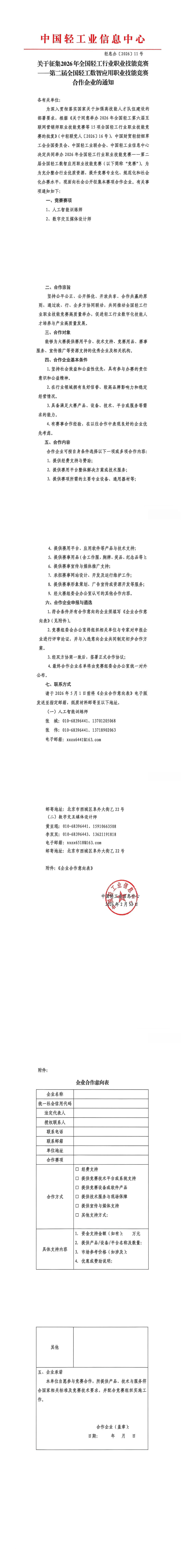 关于征集2026年全国轻工行业职业技能竞赛——第二届全国轻工数智应用职业技能竞赛合作的通知