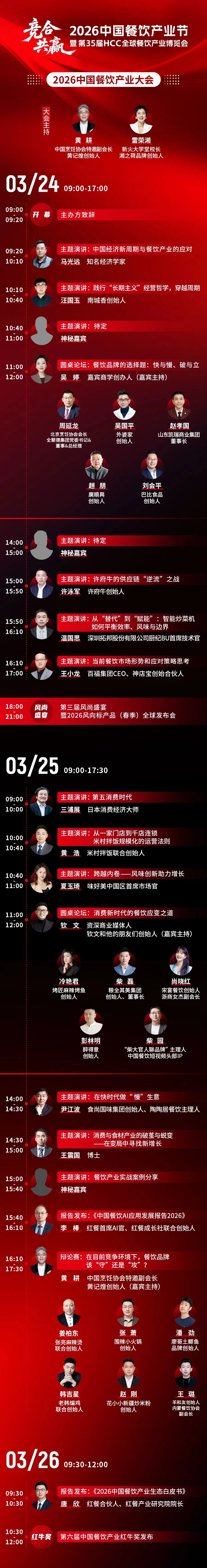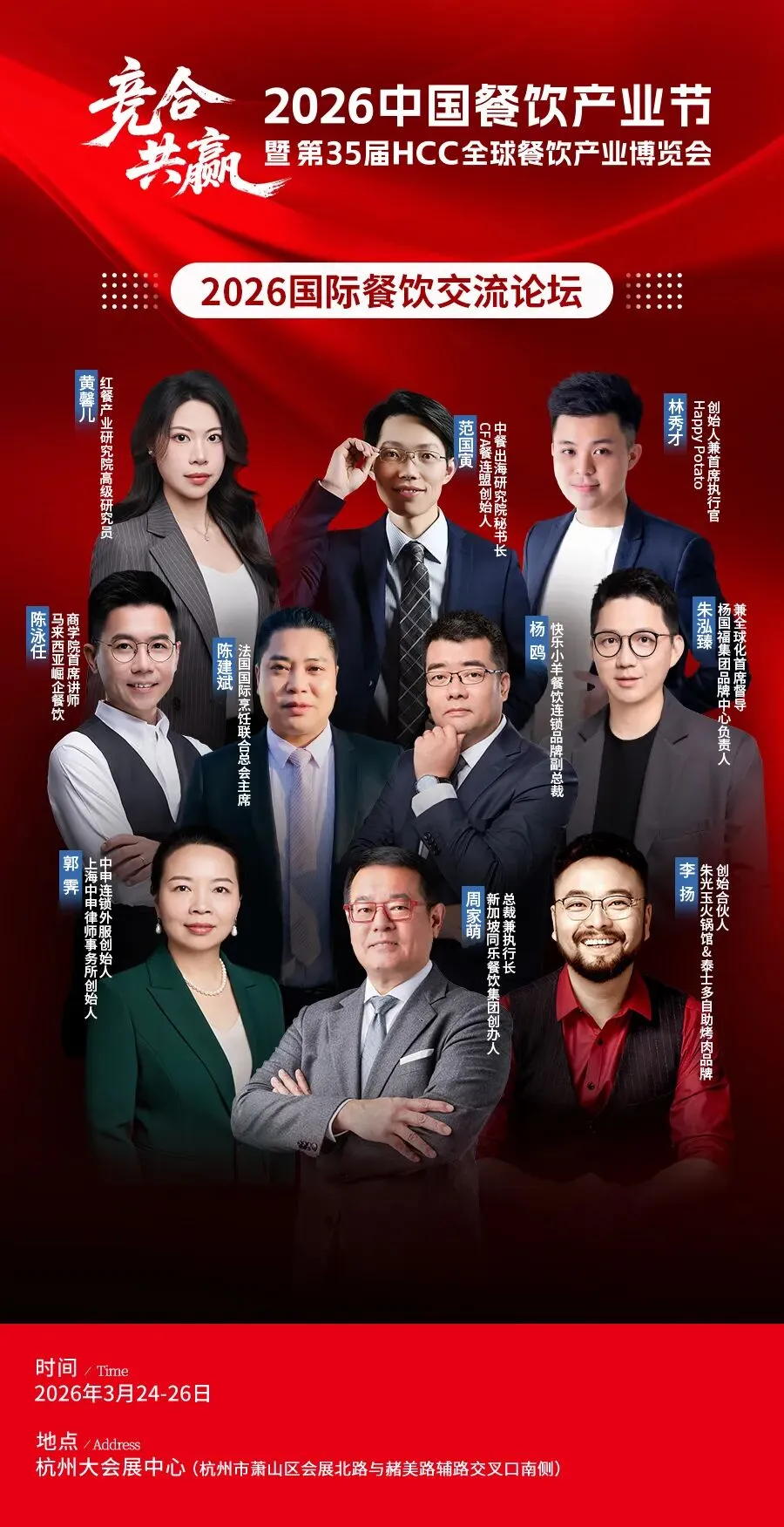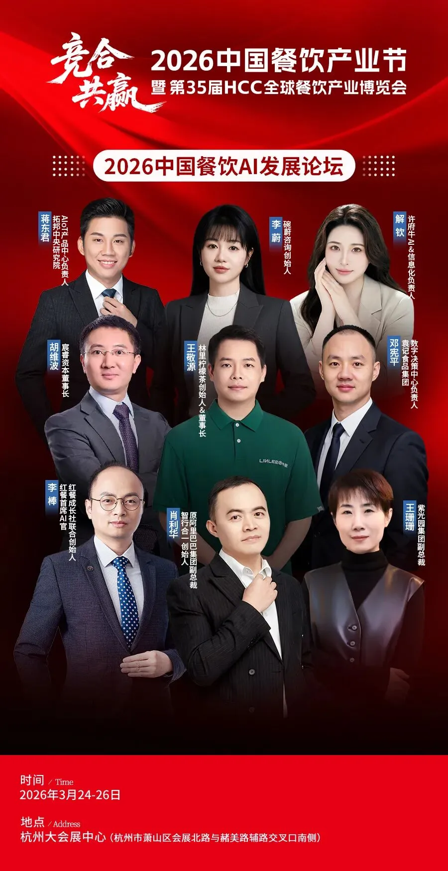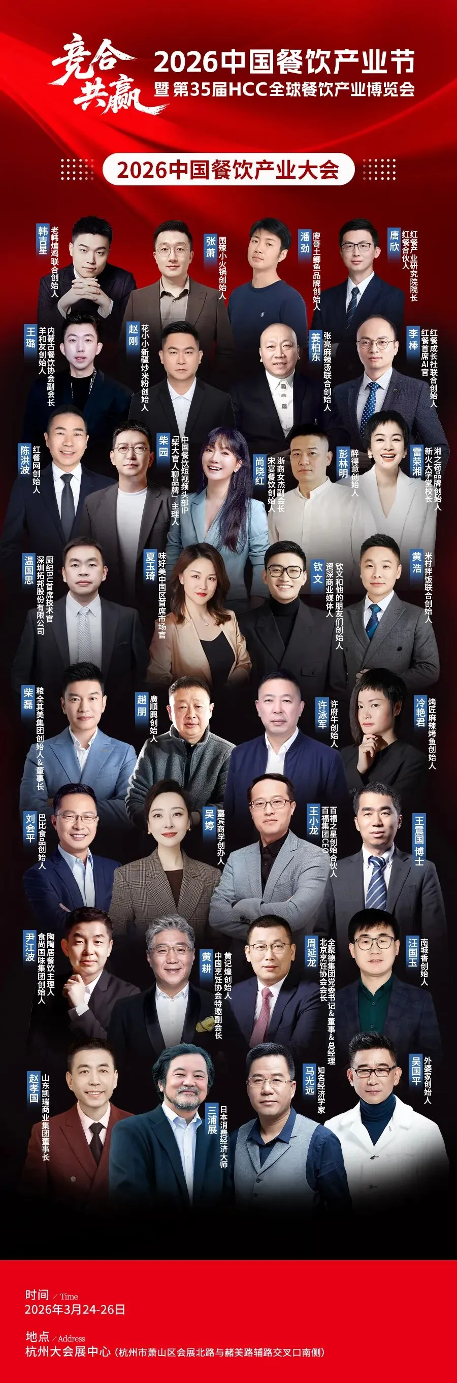 在此背景下,2026中国餐饮产业节暨第35届HCC全球餐饮产业博览会应运而生。本届产业节由世界中餐业联合会、红餐网联合主办,以“竞合·共赢”为主题,将于3月24-26日在杭州大会展中心举办。