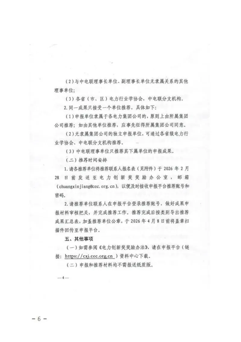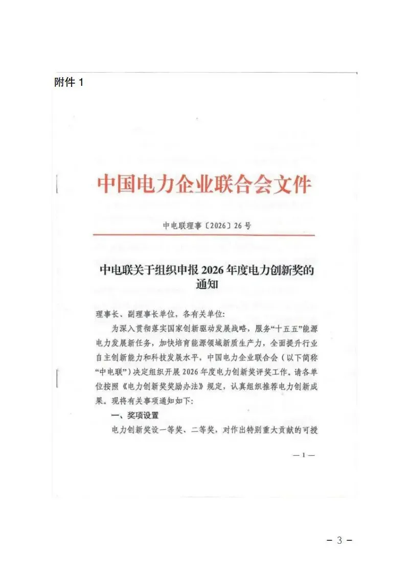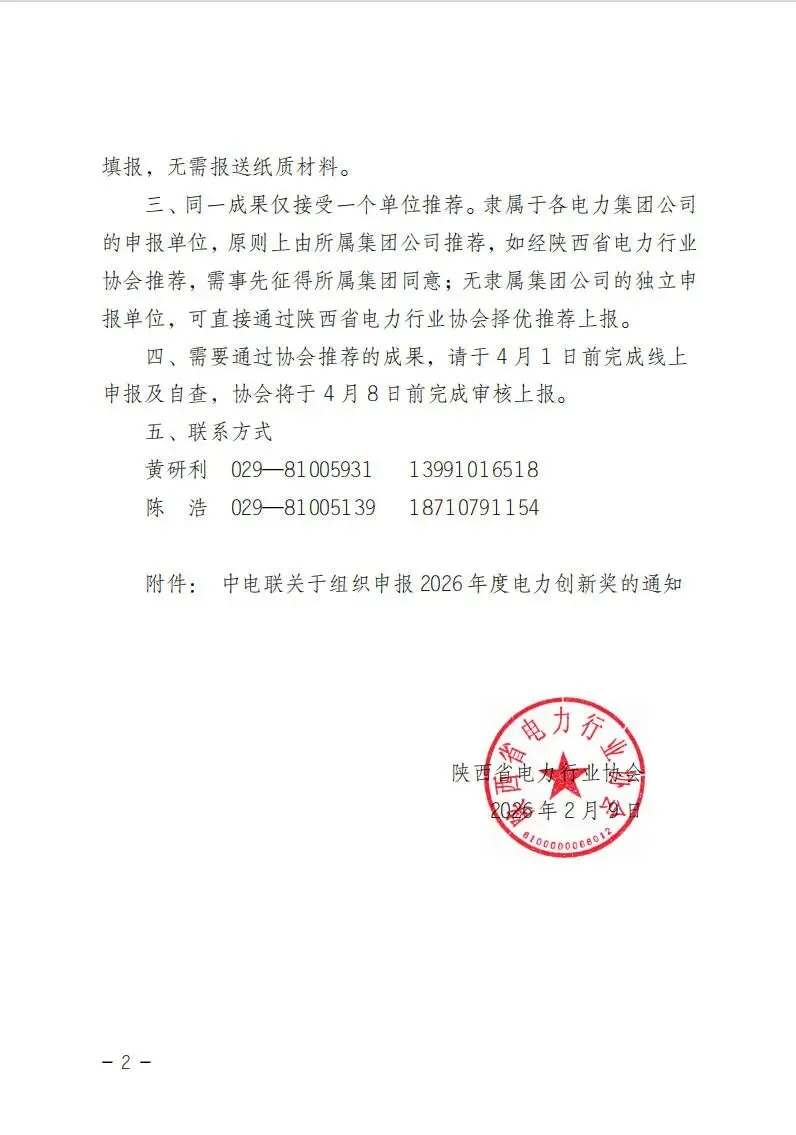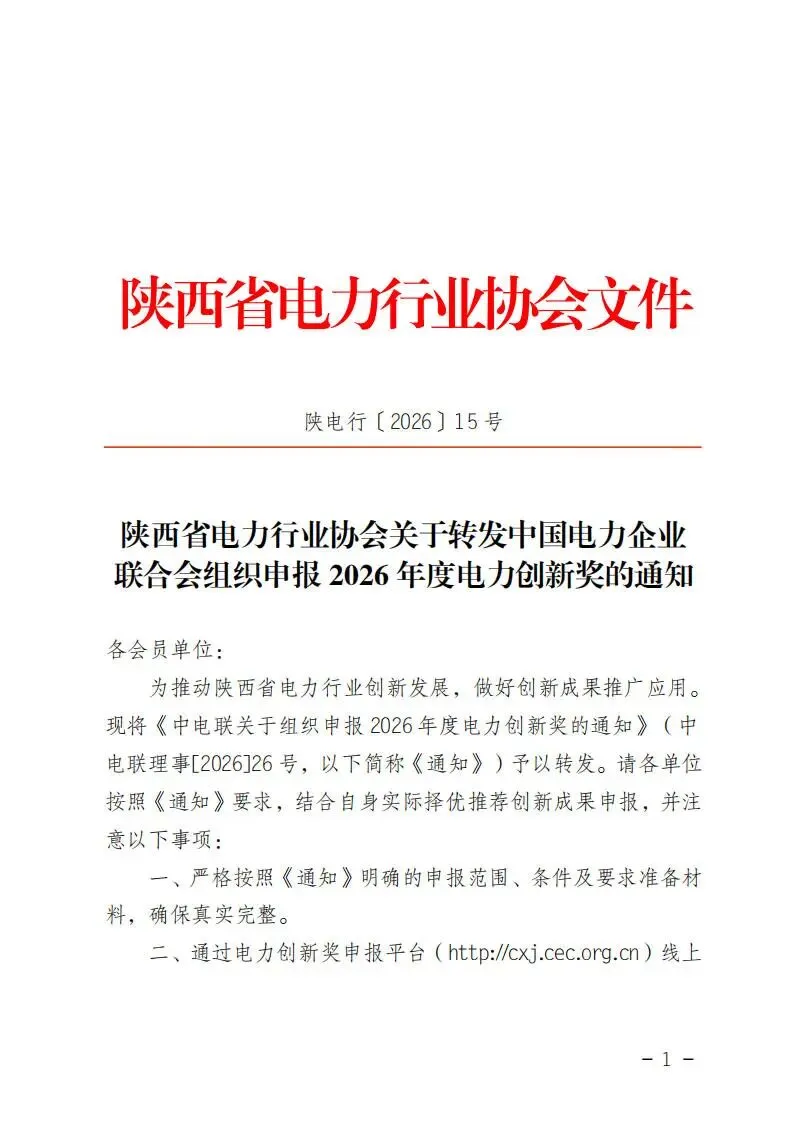陕西省电力行业协会关于转发中国电力企业联合会组织申报2026年度电力创新奖的通知