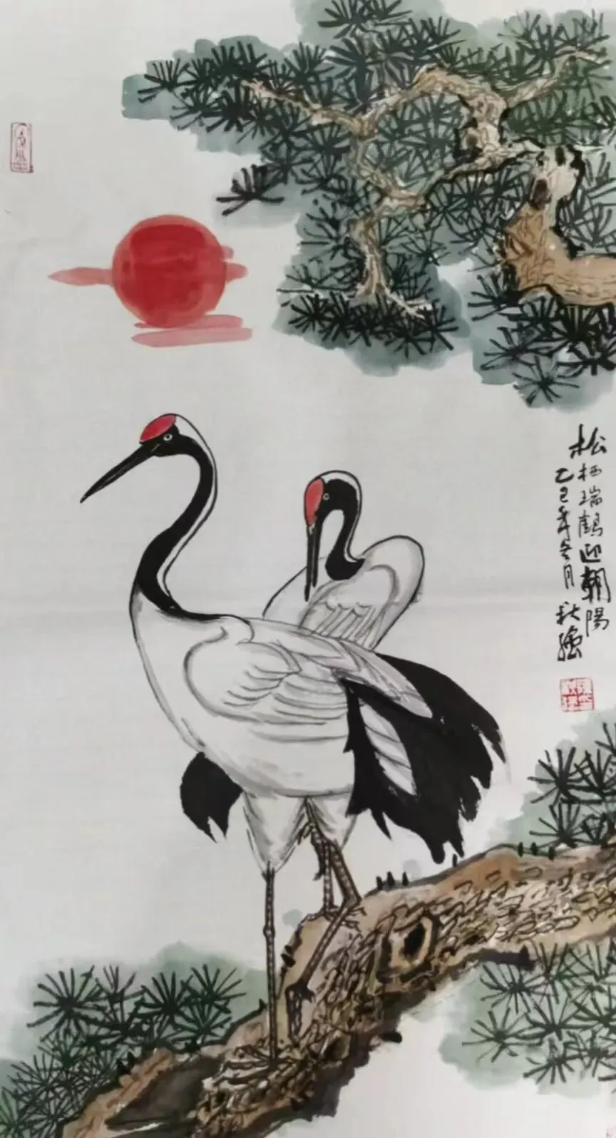 中国画 《松栖瑞鹤迎朝阳》 陈秋强