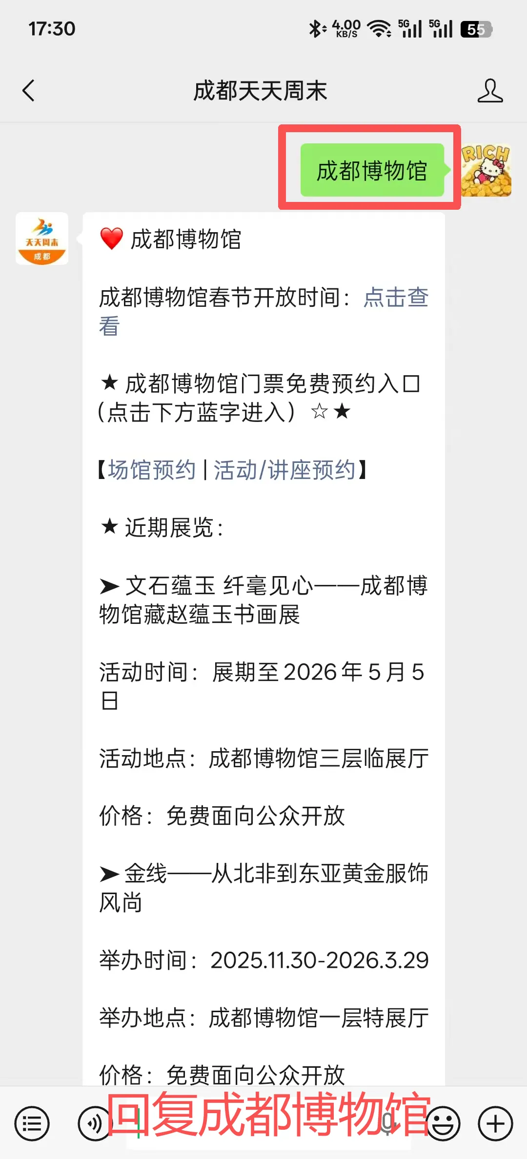 预约入口:四川博物院官微,或者进入成都天天周末公众号,在对话框回复【四川博物院】即可获取预约入口、逛展攻略。