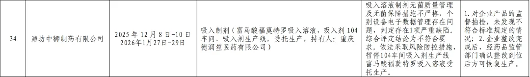 检查发现,潍坊中狮制药有限公司吸入溶液制剂无菌质量管理及无菌保障措施不严格,个别设备电子数据管理存在问题,判定存在1项严重缺陷。综合评定结论为不符合要求。依法采取风险防控措施,暂停104车间吸入剂生产线富马酸福莫特罗吸入溶液受托生产。