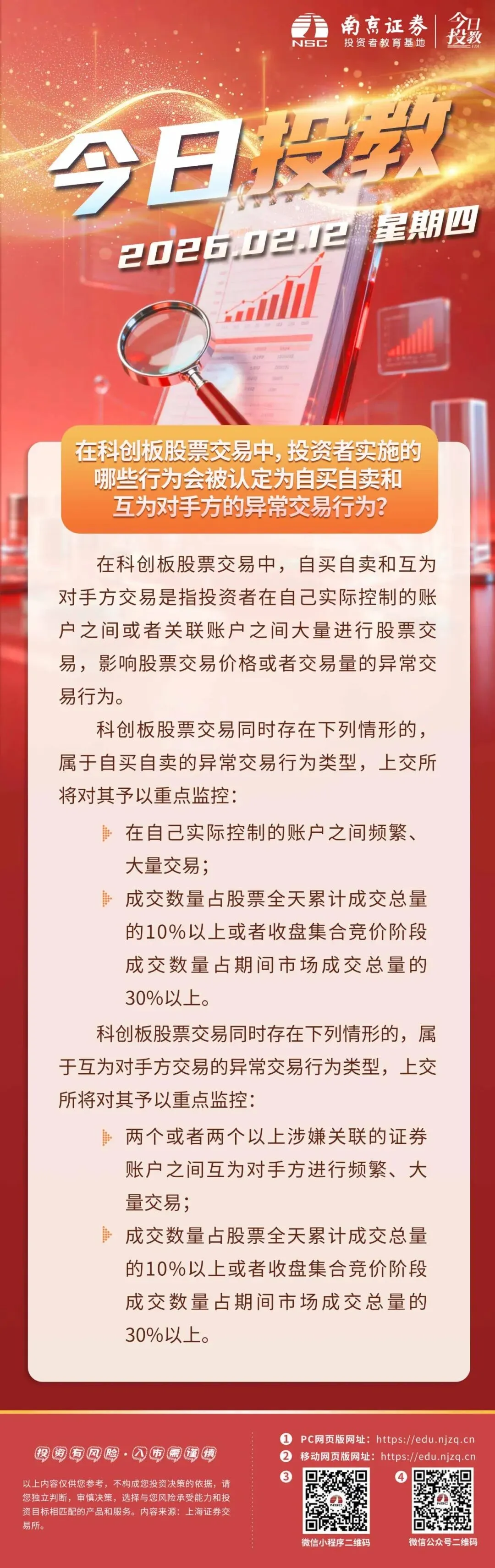 【宁证学堂】今日投教 | 在科创板股票交易中,投资者实施的哪些行为会被认定为自买自卖和互为对手方的异常行为?