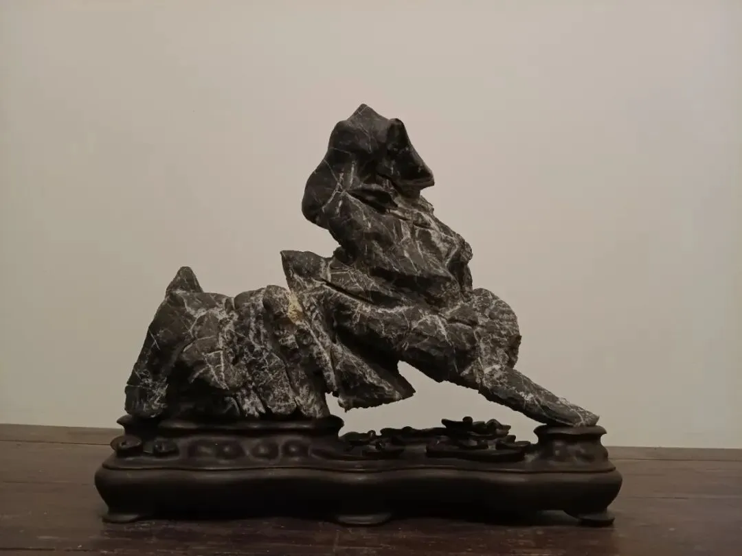 此英石瘦皱通透的形态恰似灵秀山峦的缩影,给人一种灵动秀丽之感和传达出一种超凡脱俗、潇洒自在的韵味,契合白英石所蕴含的文人气,暗示其具有独特的艺术气质和飘逸的神韵。从形上看,它瘦皱有致,线条婉转流畅,虽由天然形成,却仿佛经过了鬼斧神工的雕琢。其轮廓起伏跌宕,凹凸之间尽显自然的奇妙变化,犹如中国传统山水画中勾勒出的奇峰怪石,给人以丰富的想象空间。同时这方白英石散发着浓厚的文化气息,让人感受到一种宁静致远、超凡脱俗的精神境界。