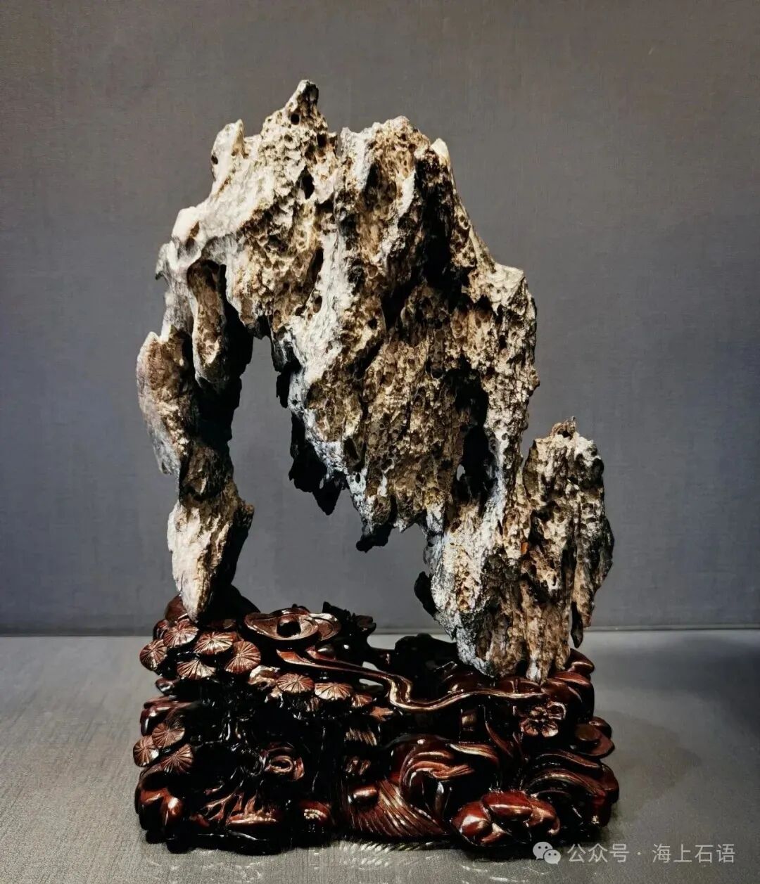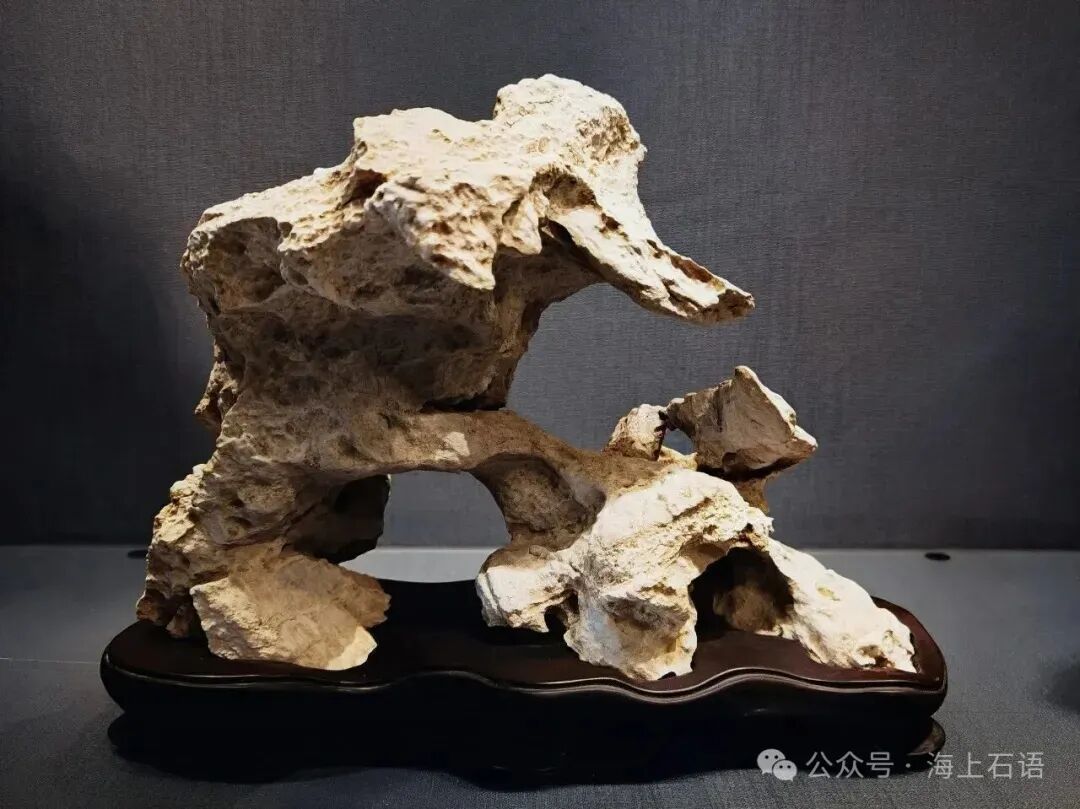 该英石形体好似游龙舞动,展现出灵动姿态及雄浑不凡气势;扭动转折的变化又如同轻盈、飘逸的彩色丝带,在灵动、空灵的韵味中又显刚劲与力量,给人以丰富的视觉感受;石头与底座有机结合而具有了道家洞天福地的特征,再加表体嶙峋,皱折深凹有致且间有孔洞,它们相互交织,形成了丰富的层次感和立体感,给人一种神秘深邃、别有洞天的感觉。从整体观赏,英石形如过桥和道家之洞天,营造出一种超凡脱俗的意境。仿佛带领观赏者进入了一个神秘的仙境,远离尘世的喧嚣,给人带来心灵的宁静与慰藉,体现了中国传统赏石文化中对自然、对意境追求的高雅情趣。