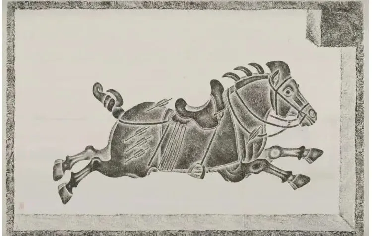 此次展出的昭陵六骏拓本藏于上海博物馆,全套6幅,钤有“长安李氏拓古印记”。由于原石为高浮雕,无法直接施拓,长安传拓名家李月溪(1881—1946)首创依原石制作平面模板,再借鉴青铜器椎拓工艺进行拓印,并补摹已失之二骏,终成全套。其子李松如承袭此技,使这一珍稀拓本得以流传。此套虽非直接取自原石,但形制比例、气韵神采皆极近原迹,堪称近代拓工技艺与文物传承的重要见证。