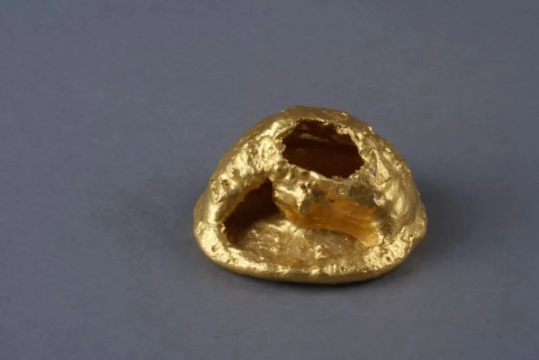 马蹄金,用以宫廷赏赐。它形似马蹄状,色泽黄亮,纯度较高,含金量98%。专家认为,由于此件马蹄金的出土地距汉惠帝安陵仅1公里,可推断,此马蹄金应是帝陵陪葬区的陪葬物。《汉书•武帝本纪》中记载了汉武帝在太始二年(公元前95年)的春天出行,登西陇高原喜获白麟,在渥洼水边见到了天马,在泰山见到了黄金等祥瑞吉兆,因此,汉武帝借白麟和天马的祥瑞,将过去的金质货币改铸成麟趾、马蹄形的黄金铸币。