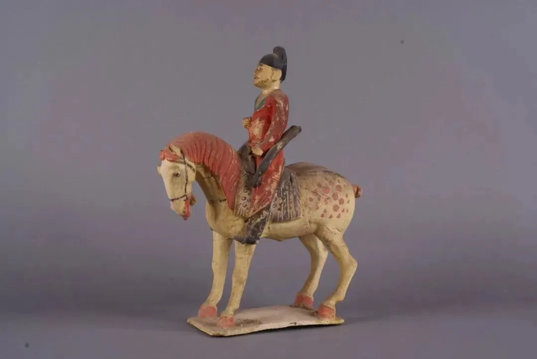 此俑戴黑幞头帽,目视前方,双手作牵马状。身穿翻领窄袖长袍,身佩刀鞘箭囊,为唐代武将造型。彩绘釉陶在唐代是一种陶俑制作新工艺,它在胎质和釉色上不同于古釉陶,与瓷器、唐三彩相似,但又有着本质上的不同。它先烧至1100℃成素胎,再施铅釉以氧化焰烧至800℃,然后再敷彩描画,彩绘釉陶故此得名。这种工艺在唐代制作工艺舞台上存在的时间很短,很快就被唐三彩所替代。由墓主生卒年月可知,虽然这一时期属于彩绘釉陶工艺发展的末期,但这件文物造型精美,描绘细腻、色彩艳丽的精品文物,充分反映了唐代彩绘釉陶制作工艺水平的精湛以及唐人对精致生活的追求程度。