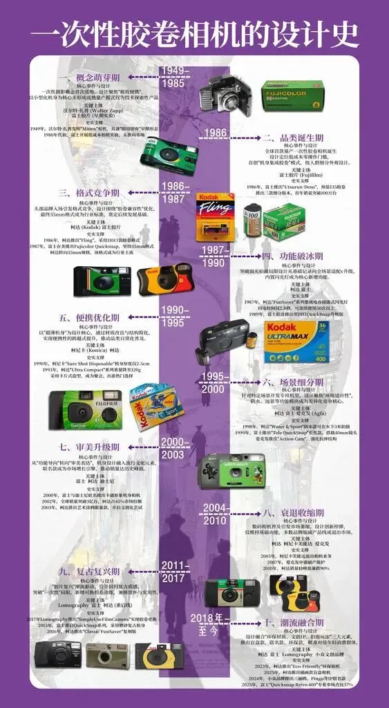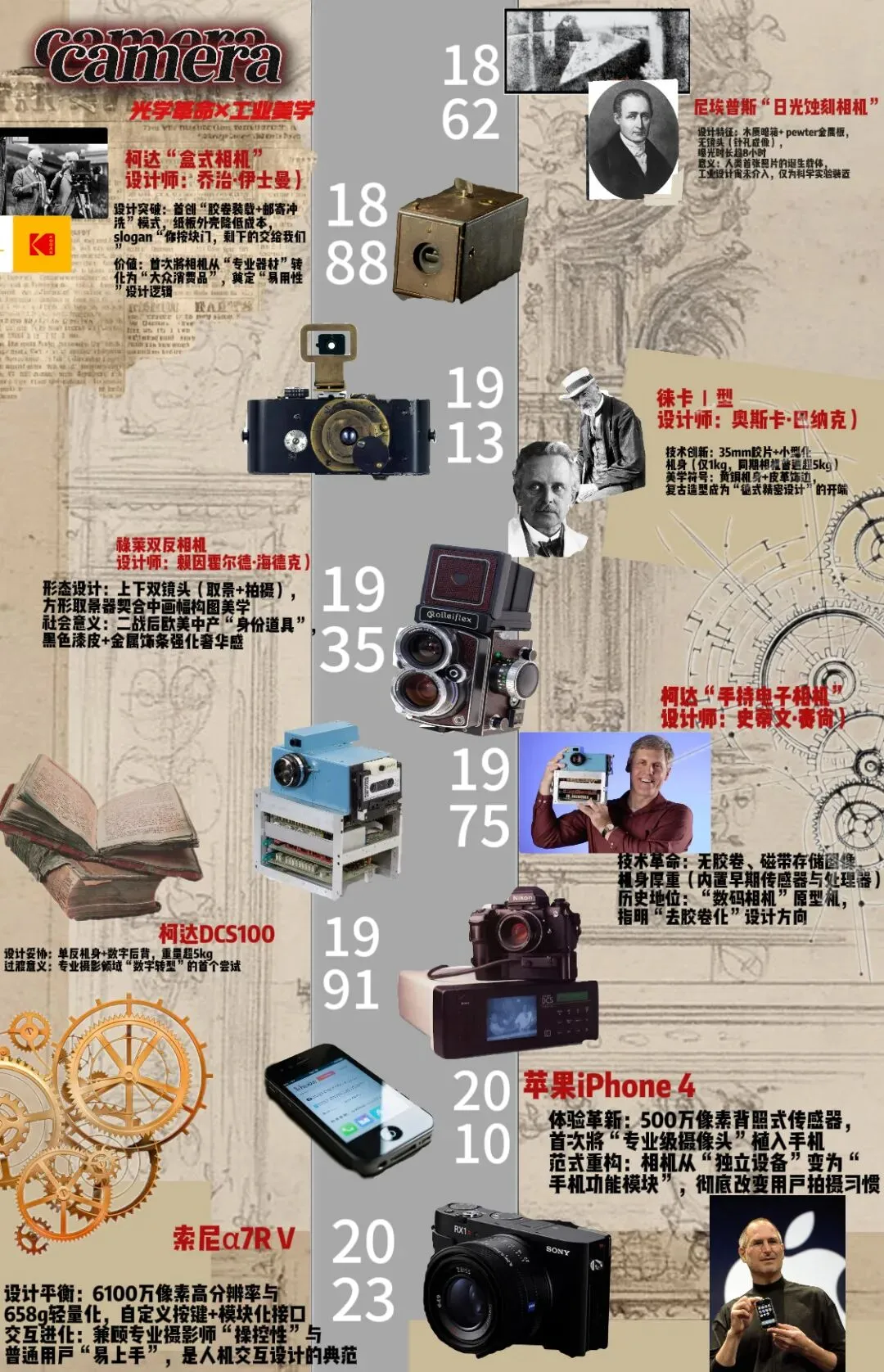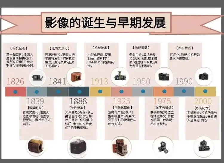 完成这张“影像的诞生与早期发展”设计史图谱,让我对工业设计史有了更鲜活的认知。过去我只将相机看作一件工具,如今通过梳理从1826年第一张照片问世到2000年手机摄影普及的完整脉络,我清晰看到技术迭代与设计思维如何相互成就——从达盖尔银版法的笨重复杂,到徕卡小型化的便携突破,再到数码相机的技术革新,每一步都是功能与美学的平衡。