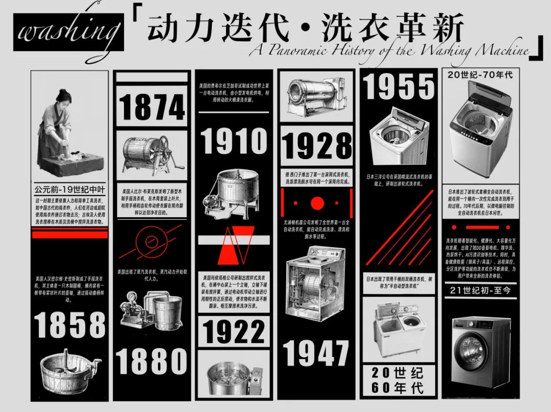 完成《洗衣机设计发展史》图谱,让我对工业设计史这门课有了全新认知。我曾以为设计史只是作品的简单罗列,这次作业却让我明白,它更是一部技术演进与社会需求相互交织的鲜活记录。