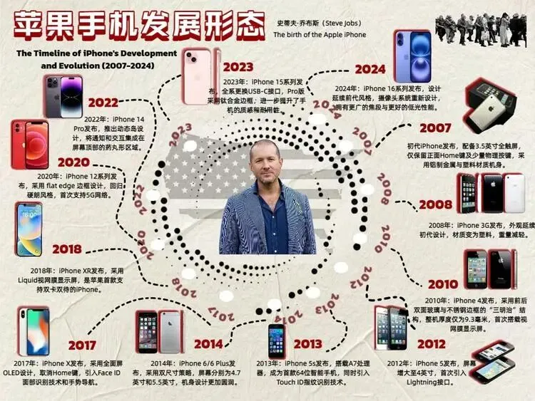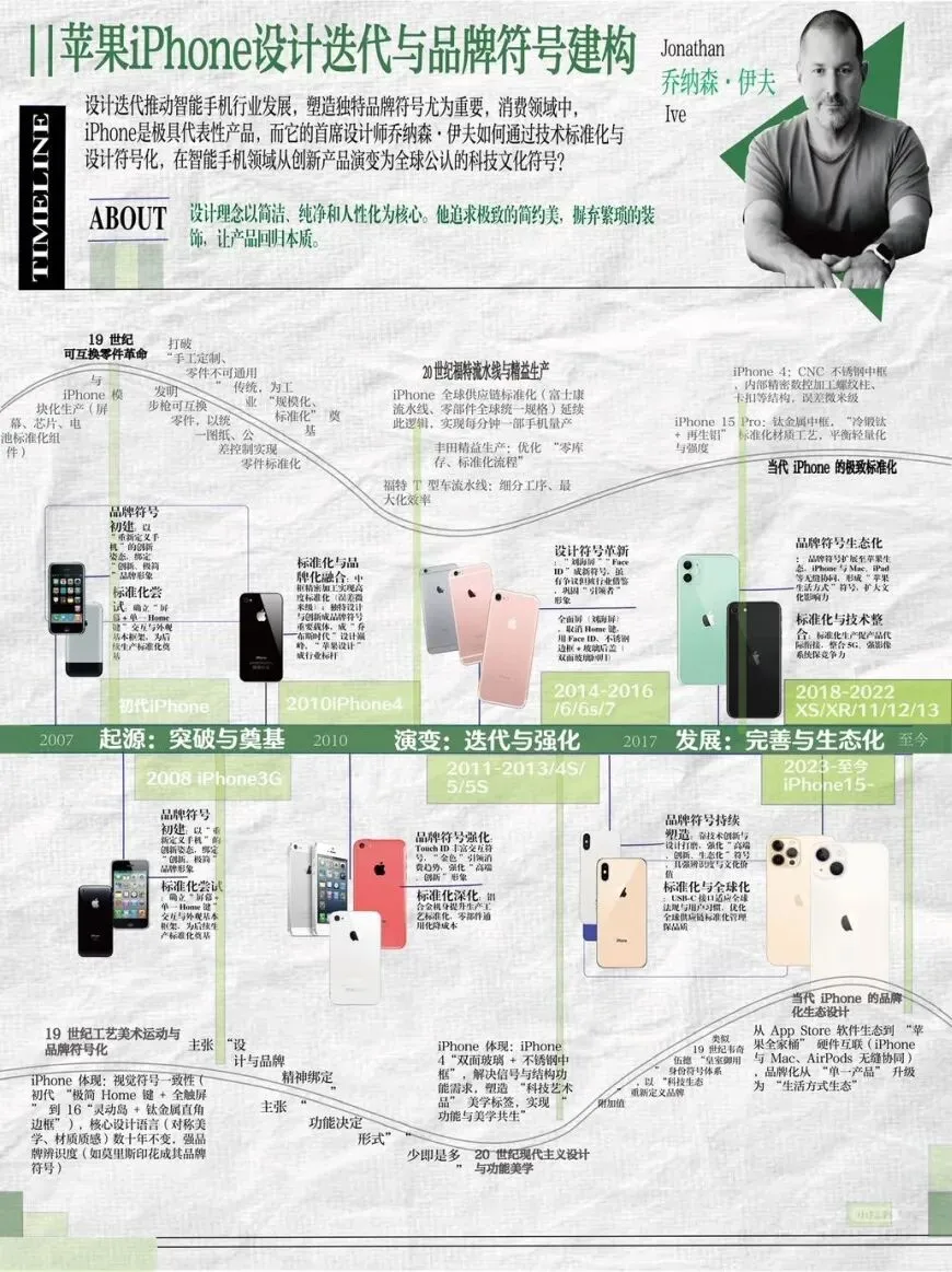 在完成苹果手机发展形态设计史图谱的过程中,我梳理了iPhone从初代至今的外观、材料、交互与核心技术的演变脉络,将零散的产品信息整合为清晰的时间图谱,有效提升了信息整合、视觉呈现、逻辑梳理与自主探究的能力。真正理解到优秀的产品设计既要立足历史文脉,又要有面向未来创新思考。