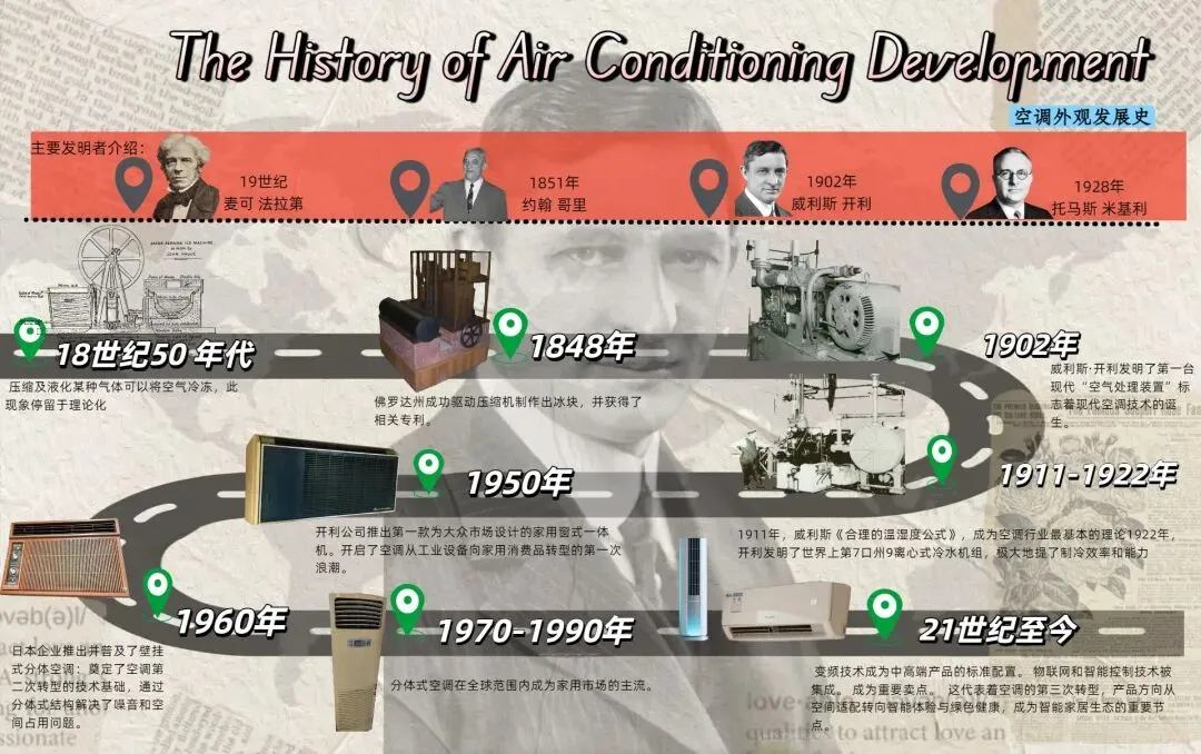 作为一名产品设计专业的学生,完成这张空调发展史图谱的作业,让我对工业设计史这门课有了全新的体会。以前总觉得设计史是书本上的冰冷知识点,但这次亲手梳理从18世纪理论雏形到21世纪智能空调的完整脉络后,我才真正理解:每一项技术突破,都是设计师为了让生活更舒适而做出的努力。