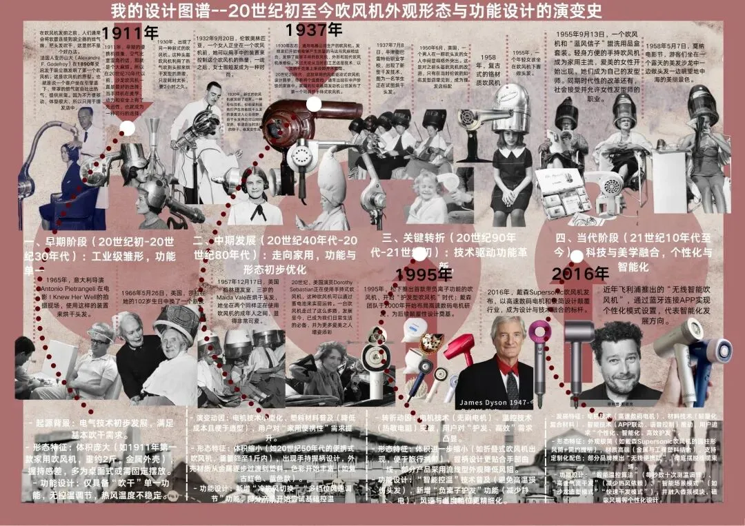 通过《工业设计史》课程的学习,我跳出了单一产品设计的局限,真正理解了“设计是时代的镜像”。从20世纪初吹风机的工业雏形,到如今智能个性化的科技产物,每一次形态迭代与功能升级,都折射出技术革新、社会需求与审美变迁的深层逻辑,让我学会以历史视角拆解设计背后的因果关联,建立起更系统的设计认知。