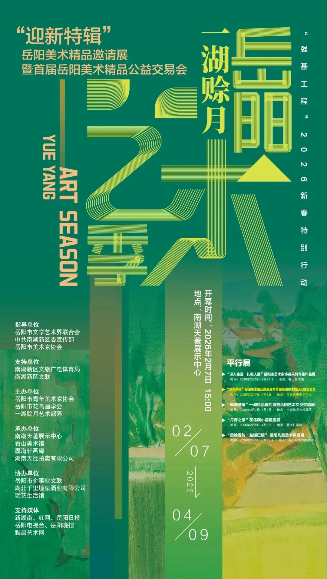 岁聿其莫,新元将启。当洞庭的烟波裹着冬日的清冽,当岳阳楼的檐角映着迎新的霞光,一场承载着巴陵文脉与艺术初心的盛宴,如期而至。“一湖赊月·岳阳艺术季|迎新特辑——岳阳美术精品邀请展”,以笔墨为媒,以新年为引,汇聚52位省市艺术家的200余件力作,在南湖之畔铺展一幅兼具传统韵味与当代活力的艺术长卷,为岳阳市民献上一份厚重而温暖的新年文化礼。