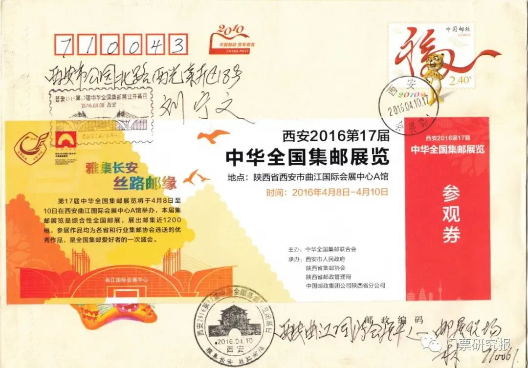 二十年前作为古都西安的一个新地标吸引了几乎每个西安人的关注与光顾,陕西电视塔下的曲江国际会展中心曾经给大家留下过难忘的记忆。特别最令笔者记忆犹新的是,2016年4月8日——10日,西安.2016第17届中华全国集邮展览在西安曲江国际会展中心隆重开幕。作为集邮者,有幸亲身参与了此次全国邮展的布展和安保工作,在共襄盛举的之时在主馆(A馆)“零距离”相伴多日,可以说,场馆的每个角落几乎都留下来我们的巡查的足迹。虽然时隔多年但当时邮展盛况空前的热闹情景依然历历在目,令人难忘。那年《门票研究》报的主编林延军也前来助兴参观邮展,这是西北地区首次举办高水平的集邮展览。因为门票组集借鉴参考了集邮的编排方式,此次高规格展览是一个很好的学习机会,他对门票的痴迷以及组集需要岂能放过这千载难逢的好机会。而观展之余的林主编以对集邮与门票相结合的“双票封”也乐此不疲,不失时机地将设计精美的西安邮展门票贴在邮资封上,真实地记录了本次观展以及西北首次大型邮展的成功举办。