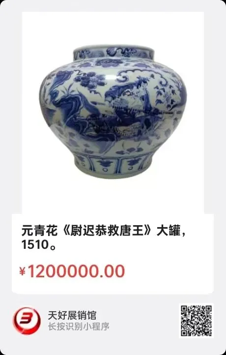元青花《尉迟恭救唐王》大罐,高27㎝,口径19.8㎝,底足径20㎝。简介:此元青花“尉迟恭救主”大罐,人物故事始于唐,盛于元,有故事情节的图纹传神,给予人们精神滋养。此瓷器胎质干燥坚实,釉色明亮匀净,苏麻离青兰釉晕散突出。器型大气优美。来源1510.V。