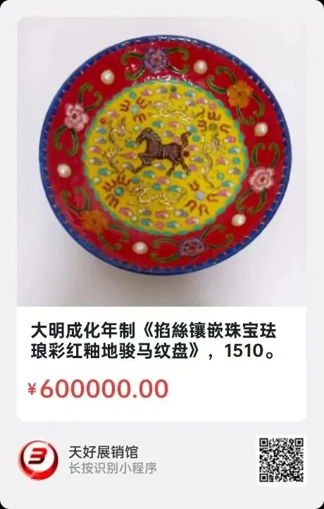 大明成化年制《掐絲镶嵌珠宝珐琅彩红釉地骏马纹盘》,高5㎝,口径21.8㎝,圏足13㎝。简介:明成化掐絲镶嵌珐琅彩骏马纹盘,是明永乐后的创新工艺,似景泰蓝工艺,但是在瓷胎上制作难度非常大,金絲镶嵌珍珠宝石,将瓷盘价值推高为奢侈品。烧制,上色,炉温把控难度大,此盘胎质纯净细腻,釉色艳丽,红黄发色纯正,骏马,飞龙,花卉纹饰绘画自然流畅,清晰生动,器型规整浑朴。来源1510.V。