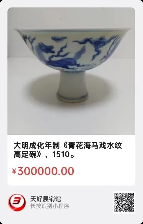 大明成化年制《青花海马戏水纹高足碗》,高10.3㎝,口径15.2㎝,底足径5㎝。简介:上述明成化年制青花海马戏水图纹高足碗,胎质细腻,白釉地,浅蓝色釉彩光亮柔和,云彩海浪海马飞翘,动感十足,按碗型作画,突显雍容气质,碗内心双蓝线勾勒,海马奔腾图纹典雅秀美。此瓷器造型端庄稳重优雅,是宫廷的宴会实用器物,具有很高的艺术价值!来源1510.V。