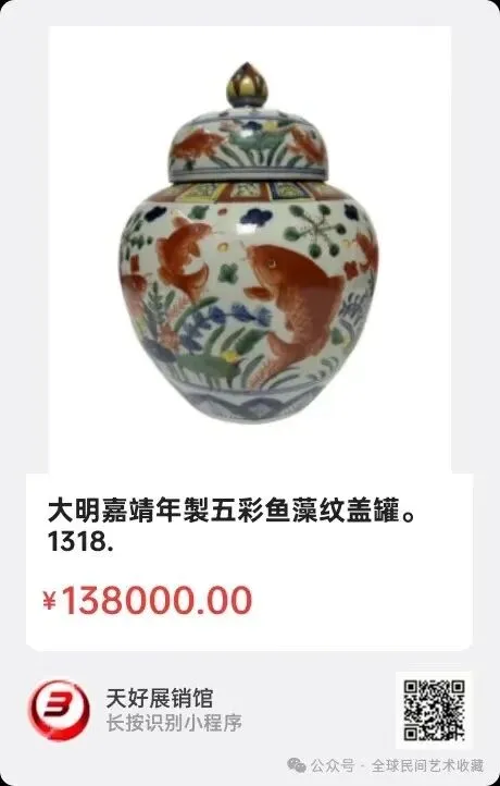 大明嘉靖年製五彩鱼藻纹盖罐。高35公分,腹宽24公分,底径15公分。来源1318.V.