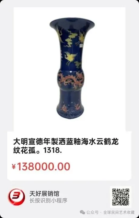 大明宣德年製洒蓝釉海水云鹤龙纹花孤。高42公分,宽14公分,口径19公分,底径15公分。来源1318.V.