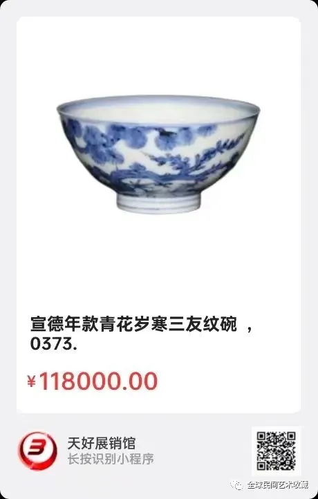 宣德年款青花岁寒三友纹碗 規格:口徑:9cm底徑:3.5cm高:4.5cm 。岁寒三友纹是中国传统寓意图案。一种典型的中国瓷器装饰纹样,多以象征常青不老的松、象征君子之道的竹和象征冰肌玉骨的梅组成表达清高坚贞气节的松竹梅纹,因这三种植物都以不畏严冬著称,故名岁寒三友,又称三友图。此外,亦见以梅、竹、石或柏、竹、梅组成的岁寒三友纹饰。岁寒三友纹,首先应该看这“三友”:松、竹、梅。松不畏冬雪,有长寿之美名;竹清高有节,梅凌寒独自开,都是君子的象征,所以岁寒三友一开始就是文人画中的常客。充满文人画的意趣,所以明岁寒三友纹是很有收藏价值的。来源:0373。V.