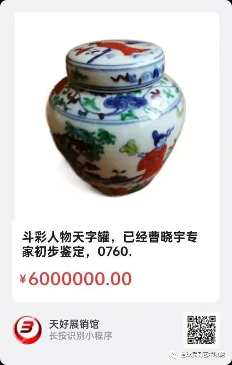 斗彩人物天字罐,高10公分,口5公分,底部7公分,直经11公分。已经曹晓宇专家初步鉴定,来源:0760.V。