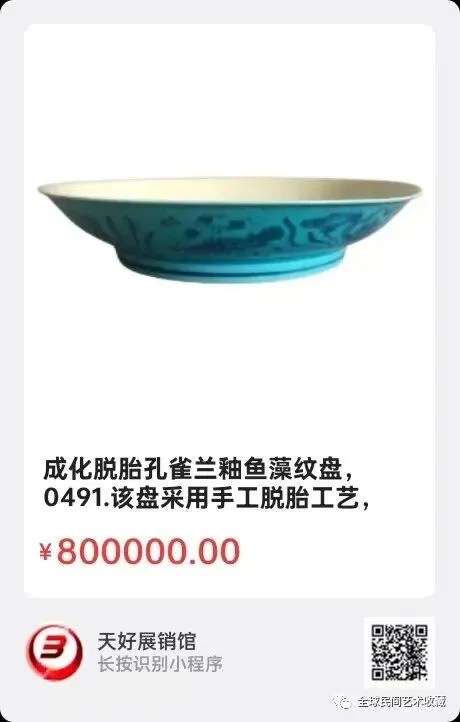 成化脱胎孔雀兰釉鱼藻纹盘,口径20Cm。该盘采用手工脱胎工艺,内白釉为高温釉,手工胎后外绘青花后上低温釉,其工艺难度可想而知。来源:0491。V 。