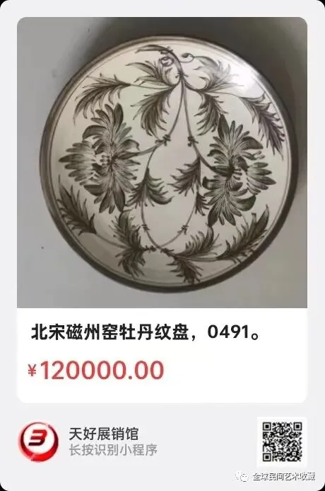 北宋磁州窑牡丹纹盘,口径28,5Cm,高4Cm。来源:0491。V 。