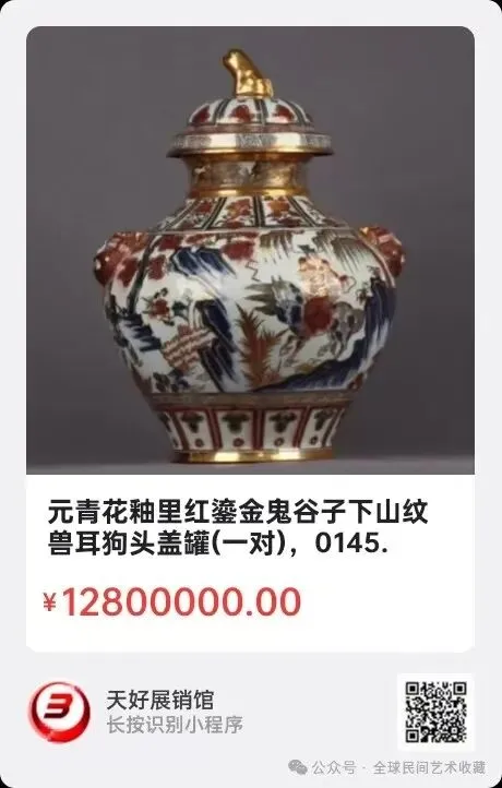元青花釉里红鎏金鬼谷子下山纹兽耳狗头盖罐(一对),藏品尺寸: 高47cm. 腹径36cm.来源0145.V.
