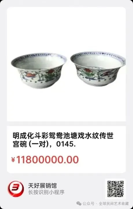 明成化斗彩鸳鸯池塘戏水纹传世宫碗 (一对),藏品尺寸:口径:15.6cm.高:7cm.足径:8.5cm.藏品来源:国外回流(于2017年从国外购买)。藏品描述:此对宫碗釉面温润,釉色微微白里泛青,老包浆。红彩凝腻醇厚,黄彩、绿彩老化开片。构图画工设计;繁简有致,叠岩多姿,刻画入微。图案唯妙唯俏,淋漓尽致,穹形尽相,活灵活现。彩料选料纯正,做工精湛,神乎其技,叹为观止。宱圈足露胎无釉处;呈火石红。碗底中心,釉下青花双圈,内裹成化特有巧拙之楷书“大明成化年制”,此对宫碗保存至今,实属不易,可为成化斗彩的佼佼者。来源0145.V.
