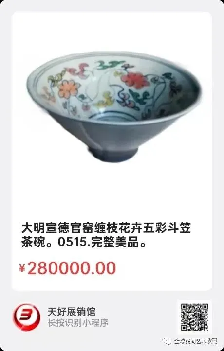 大明宣德官窑缠枝花卉五彩斗笠茶碗。高7公分。直径15公分。完整美品。来源:0515。