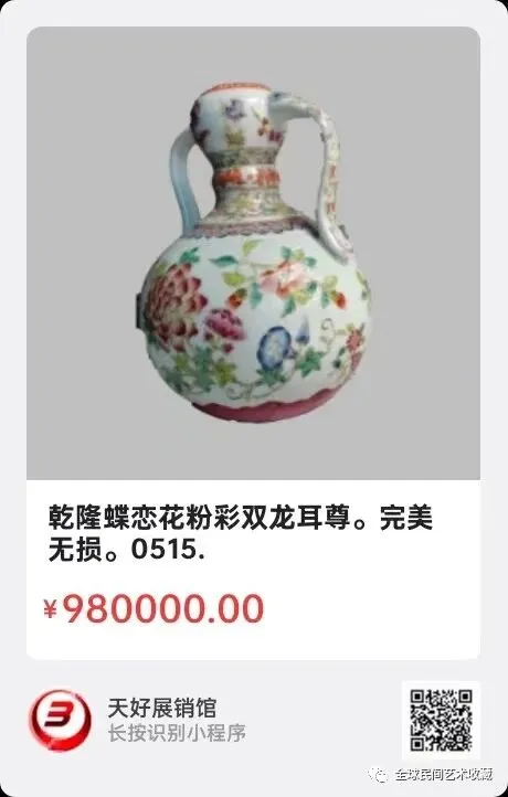 乾隆蝶恋花粉彩双龙耳尊。高23公分。完美无损。来源:0515。