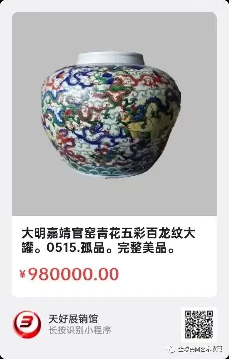大明嘉靖官窑青花五彩百龙纹大罐。高28公分。孤品。完整美品。来源:0515。