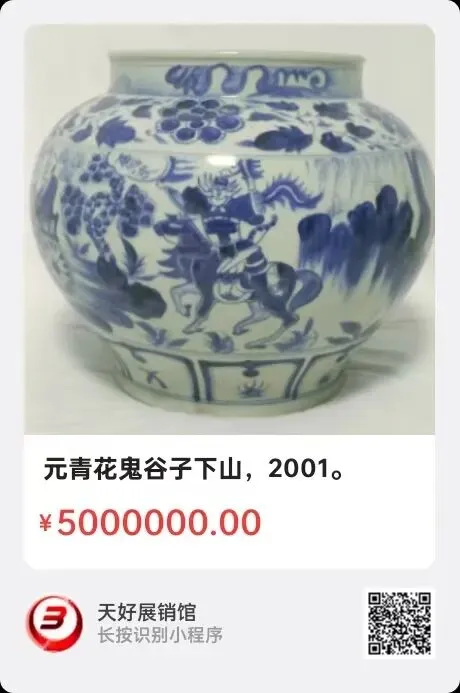 元青花《鬼谷子下山》大罐,高34cm,口径20.5㎝,底径22.5㎝。简介:元青花《鬼谷子下山救弟子》大罐,釉色白中泛黄,青釉浓郁,人物故事图纹绘画唯美,生动,线条流畅,层次分明,画工精细,故事为鬼谷子应齐国之邀下山救弟子孙膑之多人场景,绘画栩栩如生,情景感人!此罐直口短颈,溜肩圆腹,千度窑烧造,为元青花大罐奇珍。来源1510.V。