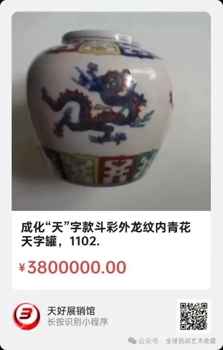 成化“天”字款斗彩外龙纹内青花天字罐 尺寸:高11cm, 宽12cm,口径6.3cm,底径8.2cm。此罐经本平台鉴定专家曹晓宇老师鉴定为成化本朝肉红胎天子罐真品。马未都先生说:“对于一个收藏爱好者来说,若能收到一个斗彩龙纹天字罐,是平生幸事”!天字罐远比鸡缸杯更为稀少珍贵。此天字罐大口,短颈,肩圆,腹收敛,大底。此罐器型标准。线条优美,十分庄重圆润,玲珑俊秀。肩部、底部饰青、黄、红、绿仰莲纹。罐身绘蓝色、绿色、黄色、青花四条游龙,龙头闭嘴五爪龙。四龙红龙脊,双目狰狞,头发冲冠,气势威武。来源1102.