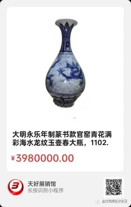 大明永乐年制篆书款官窑青花满彩海水龙纹玉壶春大瓶 尺寸:高50厘米,肚径 27厘米, 足径16厘米。此瓶径本平台鉴定专家曹晓宇老师鉴定为明代官窑老瓷器真品。玉壶春瓶又称玉壶赏瓶,它的造型定型于北宋时期,后来逐渐演变为观赏性的陈设瓷,是中国瓷器造型中的十大器型之一。海水龙纹始于唐宋五代时期。海水龙纹作为瓷器上的一种纹饰不仅贯穿整个明代,而且一直延续到清代,堪称为一种官方定型的纹饰。在构图上以龙纹为主,海水纹为辅。永乐青花器釉面肥厚,莹润平净,无桔皮纹.釉色多数发青,用进口“苏泥勃青料”,烧造时有自然的晕散现象,形成浓重凝聚的结晶斑点,呈凸凹不平状,有不同深浅的笔触感。此瓶器型硕大,造型经典,纹饰传统,制作精细,品相完好。是一件较高艺术价值的永乐青花官窑瓷器真品、珍品、臻品。(永乐官窑瓷器有款的瓷器或大件瓷器存世量是少之又少,弥足珍贵)具有较高的收藏价值和文化艺术欣赏价值。来源1102.