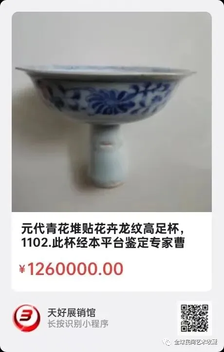 元代青花堆贴花卉龙纹高足杯 尺寸:口径14,3厘米 足径3,6厘米 高10厘米。此杯经本平台鉴定专家曹晓宇老师鉴定为元代老瓷器。该器撇口,弧腹,下承竹节状高足,足内中空。外绘青花花卉纹饰,构图简练,笔道流畅。内堆贴火云龙纹,底心绘青花火云纹,纹样草率。内口沿有青花卷草纹一周,极为灵动自然。 通体施釉肥厚,釉色明润,其胎体细腻洁白,釉质莹润亮青,青花自然晕散,为元代的青花标准器特征。外壁绘饰花卉纹,杯内壁口沿绘饰卷草纹,与外壁纹饰相呼应。精细典雅,可谓旷世隽品,极负盛名。喜爱青花之人,很难不被元青花所折服,不仅在于其在记录的数量稀少,而民间收藏中更是罕见。因此拥有元青花的收藏家确实非富即贵。此杯是一件极为难得的元代青花瓷器真品、珍品、臻品。来源1102.