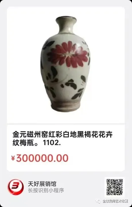 金元磁州窑红彩白地黑褐花花卉纹梅瓶。 尺寸:肚径6,8厘米 口径2,9厘米 足径4,1厘米 高11,9厘米。此梅瓶经本平台鉴定专家鉴定为金元磁州窑老窑瓷器。磁州窑梅瓶是我国古代陶瓷艺术的名贵品种。磁州窑梅瓶无论是造型之优美,还是纹饰之秀丽,都给人以无尽美感与艺术享受,美不胜收。梅瓶造型特征为小口、圆唇、短颈、丰肩、体修长及圈足等。梅瓶制品巧夺天工,吸收了以往各时代的文学修养与艺术养分,因而具有美轮美奂的审美价值。目前,国内外陶瓷博物馆均以收藏几件磁州窑梅瓶引以为荣。单件品相好、画工美的磁州窑梅瓶的拍卖价格有的已达到上千万元,其中磁州窑老窑的梅瓶,拍卖价格仍然有很大的上升空间。此梅瓶的珍贵之处在于它是非常罕见的、制作精美的、品相完好的、画工高超的、磁州窑精美的小件陈设把玩器的实物标本。来源1102.