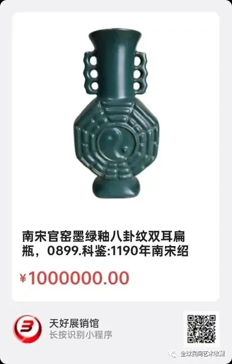 南宋官窑墨绿釉八卦纹双耳扁瓶,科鉴:1190年南宋绍熙元年制,高20.3厘米,口径6.1厘米,底径6.3厘米Ⅹ4.9厘米。嗽叭囗,长颈,颈两侧对称置二個三孔耳,腹部呈扁体八方形,正反两面模塑凸起的八卦阴阳鱼纹,高圈足外撇,内处通体施青釉,颜色墨绿,釉层较薄,釉面莹润光泽,釉表开细小纹片,圈足底部无釉露灰黑胎,造型优美,陈设礼器,是郊坛下官窑的精美佳作。来源0899.