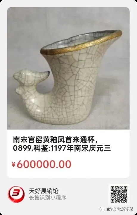 南宋官窑黄釉凤首来通杯,科鉴:1197年南宋庆元三年制,高12厘米,口径10.5厘米X6.2厘米,底径8厘米X5厘米。模制成型,斜面囗部,囗沿包铜鎏金,嗽叭器身连通凤首,暗圈足,橢圈形平底,内外通体施黄釉,釉层较肥厚,釉面莹润光滑,釉表布滿金丝铁线纹,外底有五個支钉痕,滿釉支烧,中间置一【官】字印章款,器型优美,是郊坛下官窑的精品。 来通杯是一种流行于亚欧大陆上的古老饮酒器,最早的起源可能是以动物角制作而成的饮器,即可以是杯子,也可以是注水或酒的瓶,也可能用在更重耍的礼仪场合。来源0899.