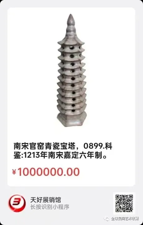 南宋官窑青瓷宝塔,科鉴:1213年南宋嘉定六年制,高32.5厘米,底径10.4厘米。模制成六面塔形,葫芦形塔尖,六面斜屋面,十层塔身,每层开六个窗,封闭的高塔基,内部中空,圈足外撇,内外通体施青釉,颜色米黄,釉层较薄,棱角处釉薄呈紫色,釉面莹润光泽,釉表开不规则的鱼鳞冰裂纹,圈足底部无釉露黑胎,涂赭色汁,器型端庄优美,是郊坛下官窑的精美佳作。来源0899.