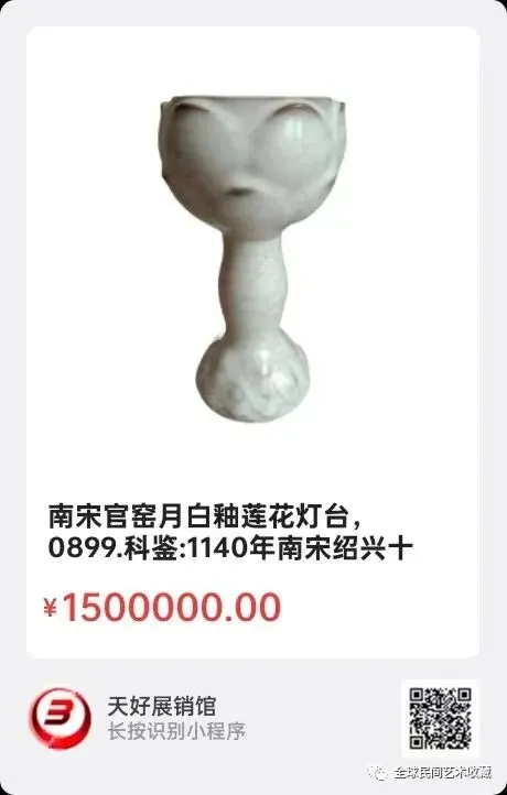南宋官窑月白釉莲花灯台,科鉴:1140年南宋绍兴十年制,高16.8厘米,口径7厘米,底径6.8厘米。圆囗,碗形头部,外壁剔刻二层莲瓣,细长腹部中间鼓起,莲苞形底部外撇,面上莲子凸起,平底,暗圈足,内外通体施青釉,颜色月白,釉层较肥厚,釉面莹润,如羊脂玉般光滑,釉表开不规则的鳝血红纹片,外底部五個支钉痕,滿釉支烧,底中间镂一圆孔,二個支钉痕之间置【修内司】楷书印章款,器型优美,是老虎洞官窑的精美佳作。来源0899.