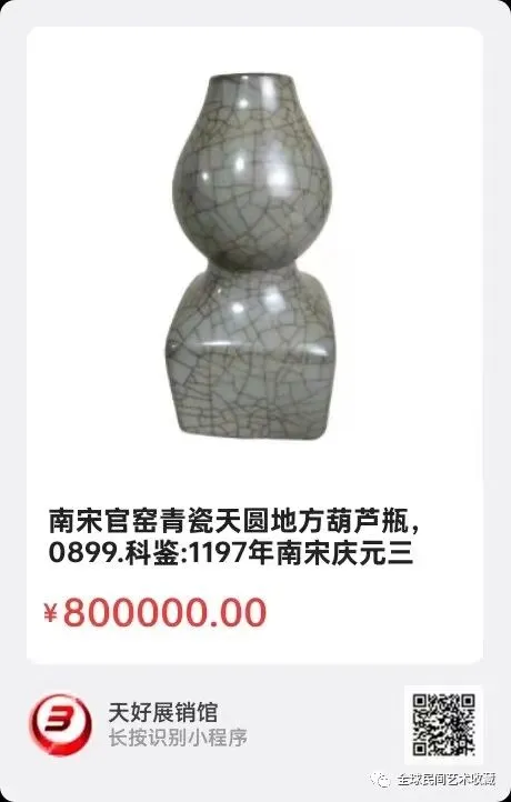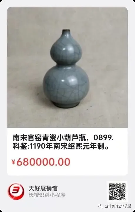 南宋官窑青瓷小葫芦瓶,科鉴:1190年南宋绍熙元年制,高10.8厘米,囗径1厘米,底径4.2厘米。小圆囗,葫芦形器身,圈足,通体内外施青釉,颜色灰青,釉层肥厚均匀,薄胎厚釉,釉面莹润光滑,如冰似玉,釉表开不规则的大小纹片,圈足底部露胎涂赭色汁,器形小巧玲珑,优美绝伦,是郊坛下官窑的稀世佳作,弥足珍贵。来源0899.