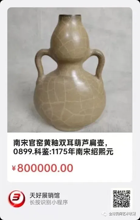 南宋官窑黄釉双耳葫芦扁壶,科鉴:1175年南宋绍熙元年制,高15.4厘米,口径2.5厘米,底径5厘米。 圆囗,葫芦形器型,上部圆形,下腹部扁圆形,中间两边置对称的双耳,矮圈足,内外施黄釉,釉层较厚,釉面莹润光泽,釉表开不规则的网纹,圈足底部露胎涂赭色汁,老虎洞官窑的精美作品。来源0899.