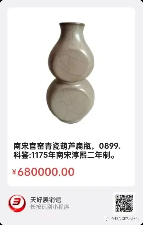 南宋官窑青瓷葫芦扁瓶,科鉴:1175年南宋淳熙二年制,高16.2厘米,口径3.5厘米,底径5.4厘米。圆囗外撇,束颈,葫芦形器身,正反两面扁平,矮圈足,垫烧,内外施土黄釉,釉层肥厚均匀,釉面莹润光泽,釉表开不规规的大纹片,圈足底部露胎,涂赭色汁,外底中间置一“官”字印章款,是老虎洞官窑的精美佳作。来源0899.