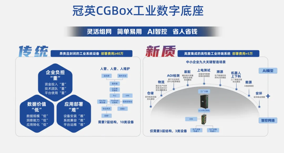 冠英CGBox工业数字底座系列产品结合AI智控机器人等产品的应用,可为企业实现数据采集应用、设备智能管理、生产效率提升、工艺水平持续提升提供了低成本解决方案,不仅让企业“用得上、用得起、用得好”,而且还能带来“看得见”“够得着”的数字化转型效益;同时冠英以“共享智造”的创新模式,围绕产业集群的共性需求建设共享工厂,实现了产业集群集群品牌的打造,形成集群统一接单,协同制造的全新局面,以整体集群品牌的竞争力代替单个企业,推动产业集群实现品牌影响力、产业集群产值、企业数智化水平等各方面的提升。