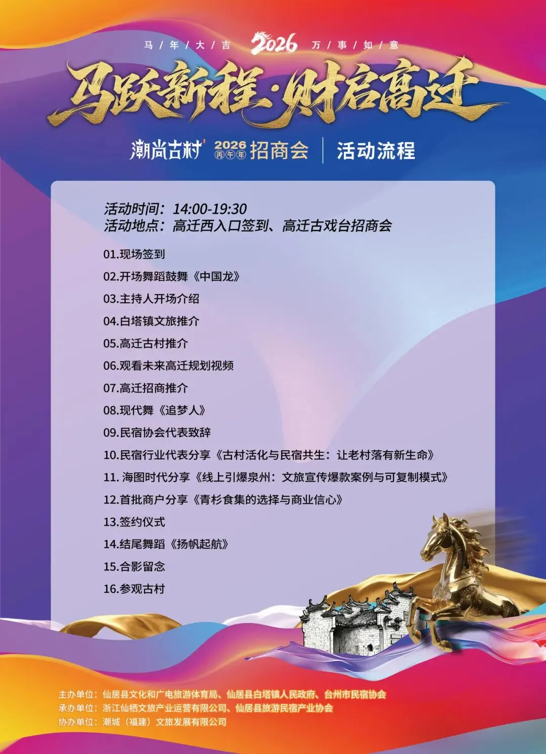 正月初六正是迎财纳福、马到功成的吉日良辰。仙居县白塔镇高迁古村将首次以“财神”为引、以“古建”为媒,隆重举办“马跃新程·财启高迁”招商会,诚挚邀请全国文旅投资人、民宿主理人、文创先锋、商会协会、各界优秀人士齐聚这座活着的明清古村落,共启新岁财源,共话古村新生,遇见一场别开生面的“迎财”之约。