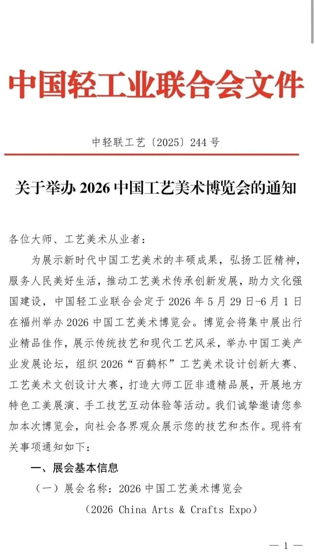 为展示新时代中国工艺美术的丰硕成果,弘扬工匠精神,服务人民美好生活,推动工艺美术传承创新发展,助力文化强国建设,中国轻工业联合会定于2026年5月29日-6月1日在福州举办2026中国工艺美术博览会。博览会将集中展出行业精品佳作,展示传统技艺和现代工艺风采,举办中国工美产业发展论坛,组织2026“百鹤杯”工艺美术设计创新大赛、工艺美术文创设计大赛,打造大师工匠非遗精品展,开展地方特色工美展演、手工技艺互动体验等活动。我们诚挚邀请您参加本次博览会,向社会各界观众展示您的技艺和杰作。现将有关事项通知如下: